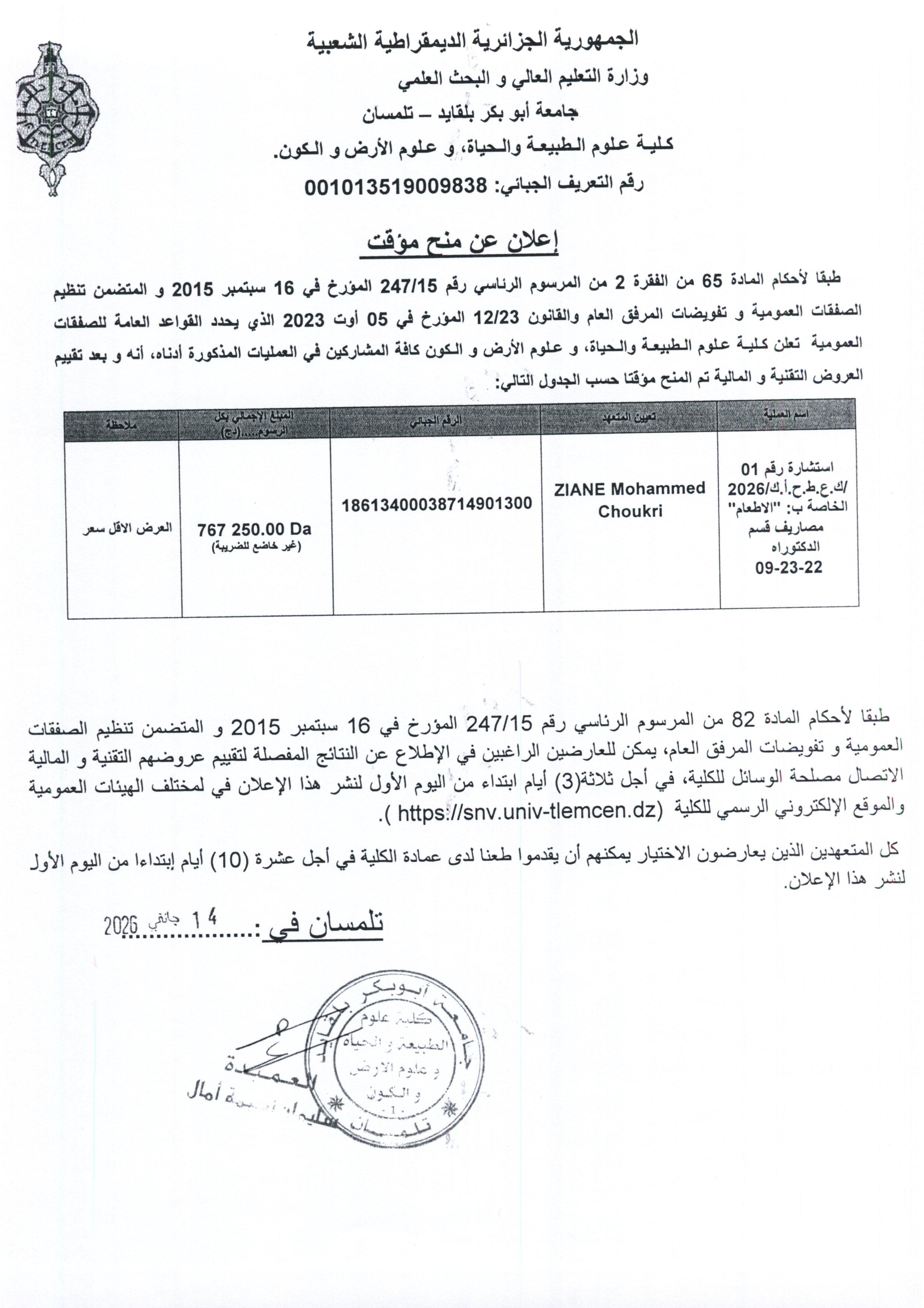 01اعلان عن المنح المؤقت