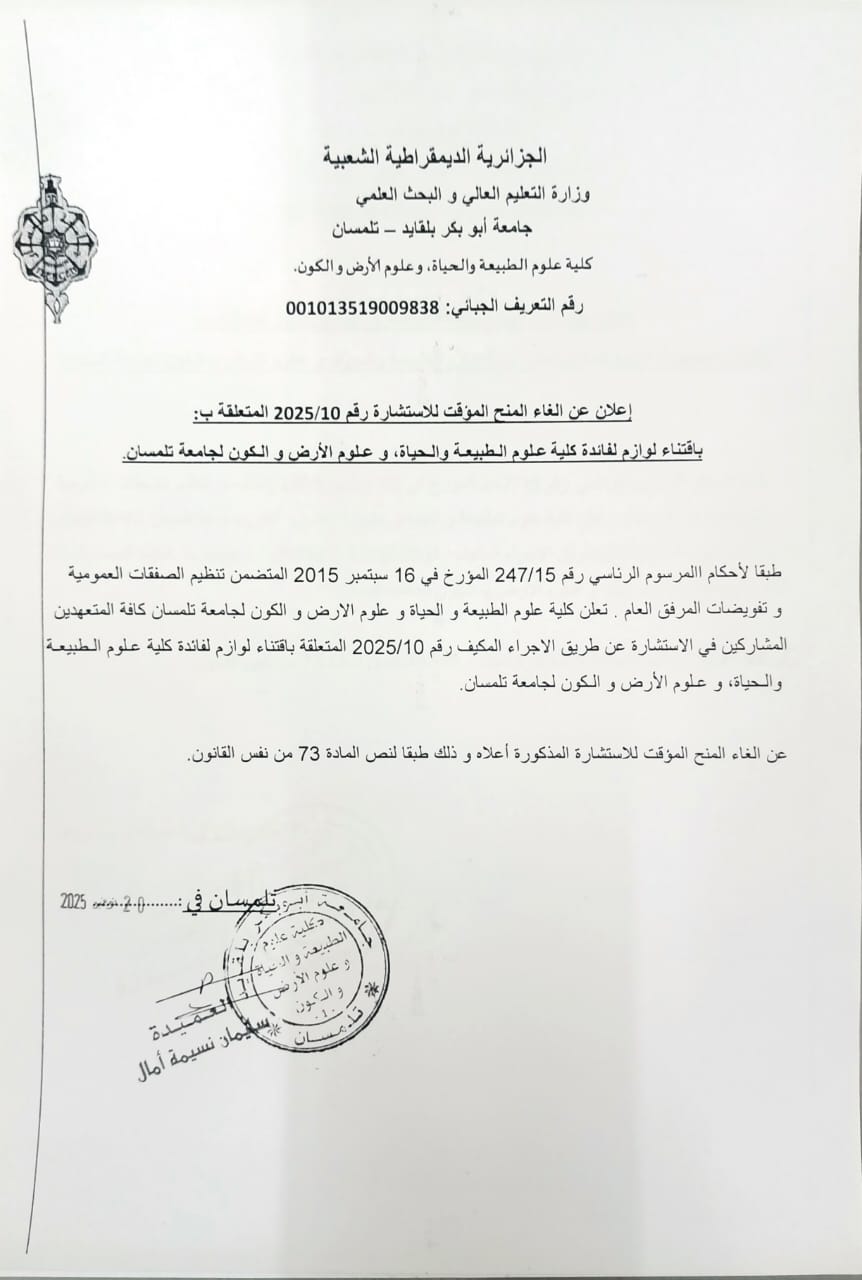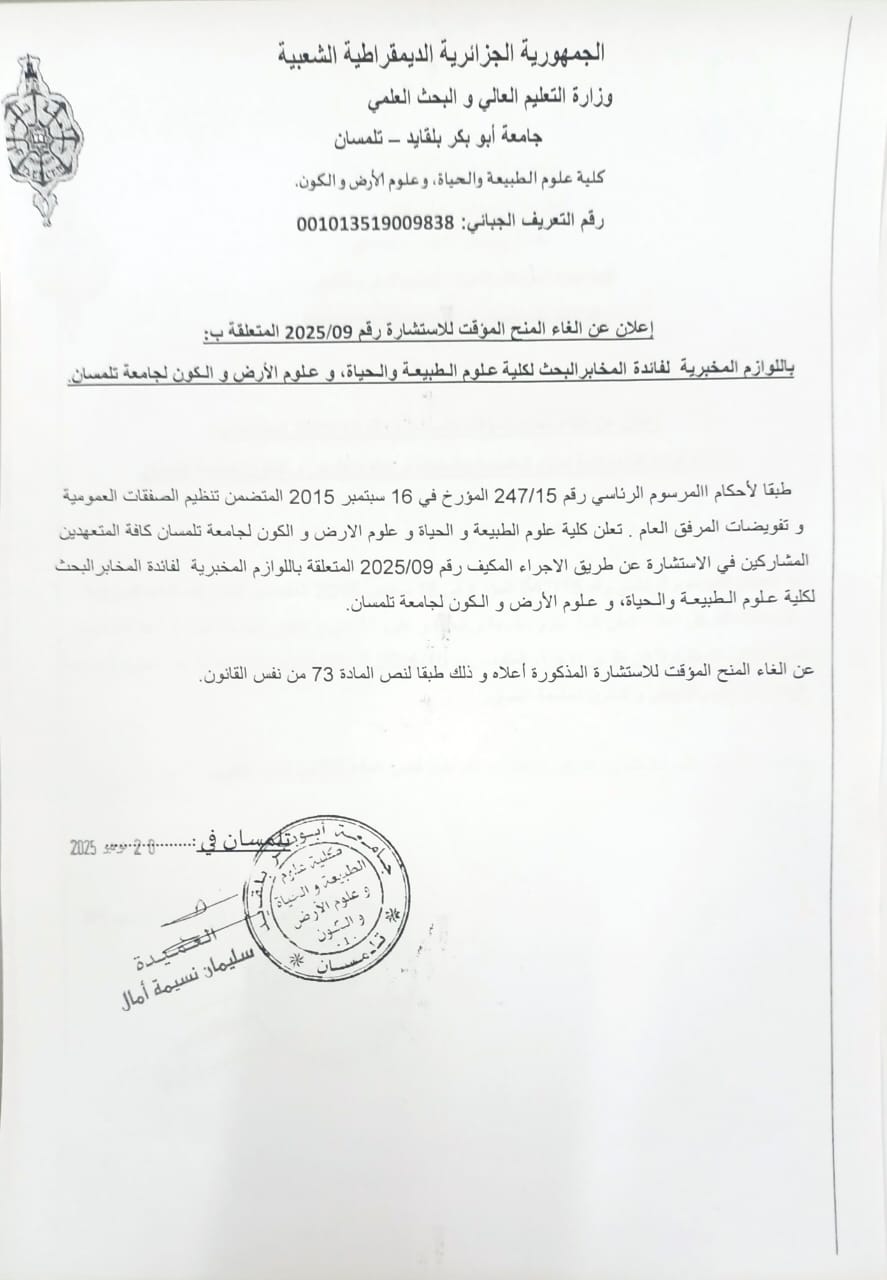 إعلان عن إلغاء المنح المؤقتة رقم09 ورقم10